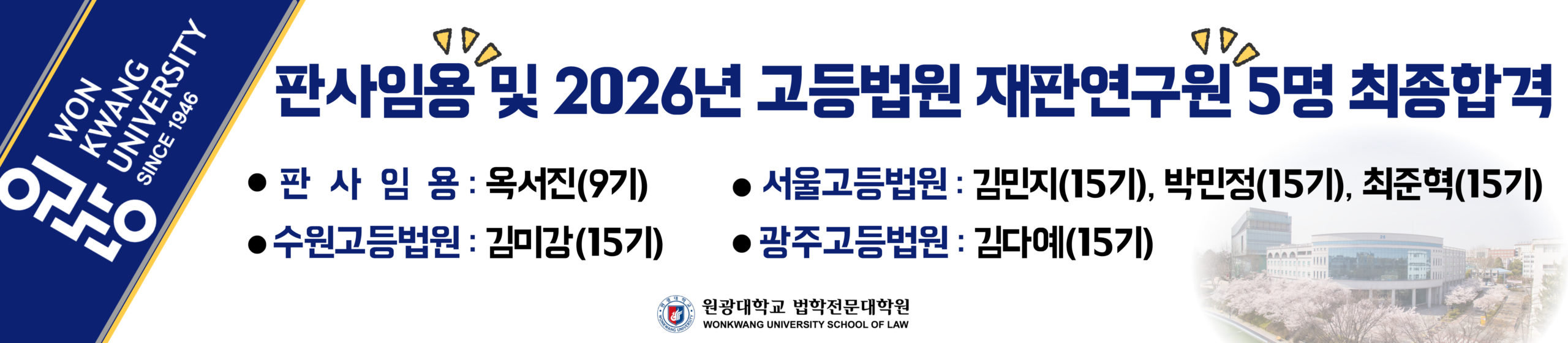 2026학년도 신입학전형 원서접수 : 2025.09.22.(월) 09:00 ~ 09.26.(금) 18:00 자세히보기 교육시설 원광대학교 법학전문대학원 시설안내 자세히보기 교수진 소개 법학전문대학원 교수진을 소개합니다 자세히보기 행정공지사항 2026년 입영대상 법무장교 지원 안내2025-10-15 2025학년도 제4차 졸업시험(10월) 학생생활관 방배정 안내(수정)2025-10-13 제15회 변호사시험 원서접수 소명서류 체크 방법2025-10-13 09.28.(일) 법학전문대학원 물탱크 청소 안내2025-09-22 외부기관공고 [법무법인 미션] 2026 동계 로스쿨 실무수습 공지2025-10-31 [DLG] 2026 동계 법학전문대학원 실무수습 모집2025-10-31 [한국공정거래조정원] 2026년 법학전문대학원 동계 공익 법무실습 안내2025-10-30 [로스쿨 제도의 공익적 개선을 위한 정책 포럼] 안내2025-10-29 학사공지사항 2025-2학기 중간고사 시간표 안내(수정)2025-10-15 2025학년도 제4차 졸업시험(제3차 변호사시험 모의시험) 사전 필수 확인 사항2025-10-14 2025학년도 제4차 졸업시험(제3차 변호사시험 모의시험) 응시자 준수사항2025-10-14 2025학년도 제4차 졸업시험(제3차 변호사시험 모의시험) 선택과목 법전 공지(수정)2025-10-14 연락처(063) 교학과 TEL 850-5084 또는 5085 교학과 FAX 850-5086 교학과 위치 법학전문대학원 1층(익산대로 460, 26번 건물) WonkwangGuide 법무부 변호사시험법학연구소리걸클리닉센터(...경력개발센터학생지도센터법학전문도서관