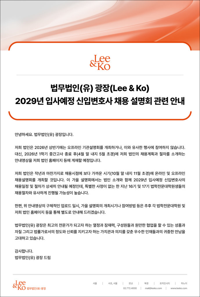[법무법인(유) 광장] 2029년 입사예정 신입변호사 채용 설명회 관련안내