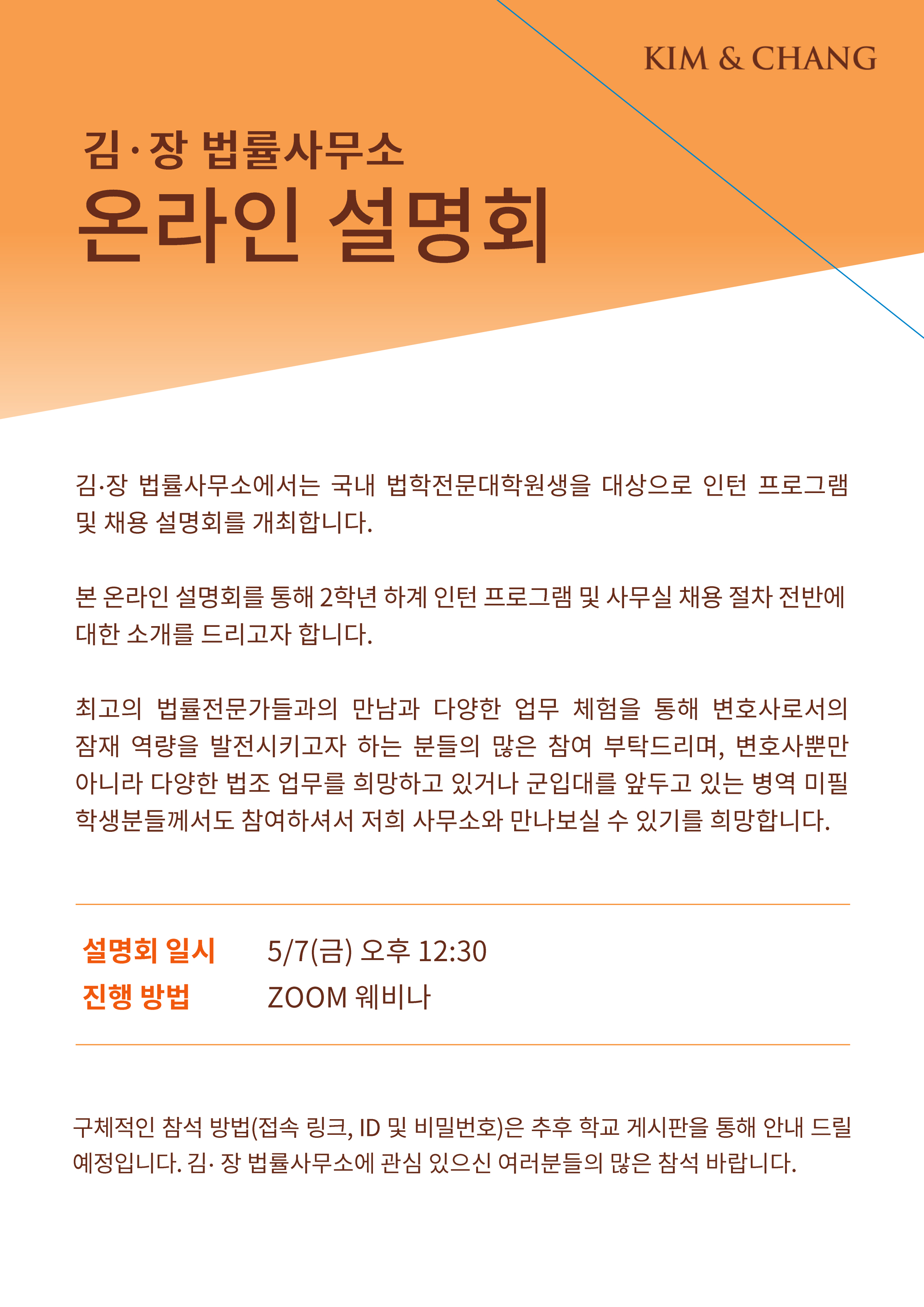 외부기관공고 홈알림마당외부기관공고 (재공지)[김.장 법률사무소] 2021 상반기 온라인 설명회 안내문 (재공지)[김.장 법률사무소] 2021 상반기 온라인 설명회 안내문 법학전문대학원2021-05-06 페이스북 트위터 구글플러스 이메일 프린트 [김.장 법률사무소] 2021 상반기 온라인 설명회 안내문 접속링크 비밀번호 : 941825 이전외부기관공고다음