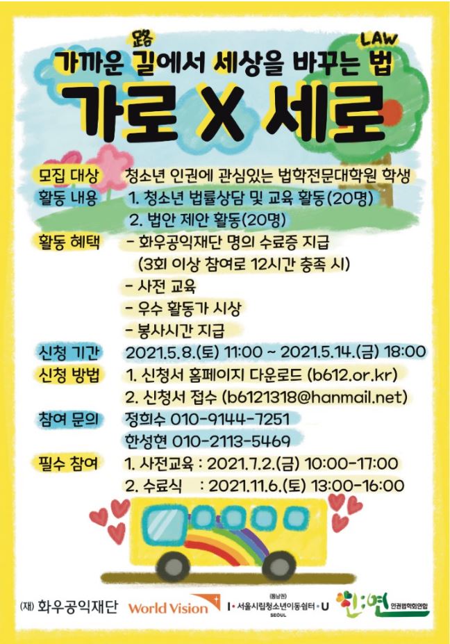 서울시립청소년이동쉼터(동남권)은 가정 밖 청소년의 인권보호를 위해 2021 거리청소년인권보호 ‘가로x세로'(가까운 길에서 세상을 바꾸는 법)를 아래와 같이 실시하오니 귀 대학원의 법학전문대학원생이 적극 참여할 수 있도록 홍보 바랍니다. 1. 사 업 명 : 2021 거리청소년인권보호사업 ‘가로x세로’ 2. 모집기간 : 2021. 5. 8.(토) 11:00 – 5. 14.(금) 18:00 3. 모집대상 : 전국법학전문대학원 재학생(휴학생 포함) 4. 제출기한 : 2021. 5. 14.(금) 18:00까지 5. 제출방법 1) 서울시립청소년이동쉼터 홈페이지(b612.or.kr) 접속 2) 공지사항(2021 거리청소년인권보호사업 ‘가로x세로’ 법학전문대학원생 모집) 3) 신청서 다운로드 및 작성 ※다운로드 첨부파일 : 신청서 4) b6121318@hanmail.net 발송 6. 협력기관 : (재)화우공익재단, 월드비전, 전국법학전문대학원 인권법학회연합(인;연) 7. 사업대상 : 가정 및 학교 밖 청소년 8. 주요내용 : 청소년 법률상담(청소년 인권, 노동법 등) 및 인권교육, 법안제안 등 9. 장 소 : 서울시립청소년이동쉼터(동남권) 활동지, 화우공익재단 등 10. 요청사항 : 학교 웹페이지를 통한 모집글 공유 및 학내 포스터 부착을 통한 참여 활성화 11. 특 전 : 참여한 법학전문대학원 대상 (재)화우공익재단 이사장 수료증 수여 자세한 내용은 포스터 참조 부탁드립니다!
