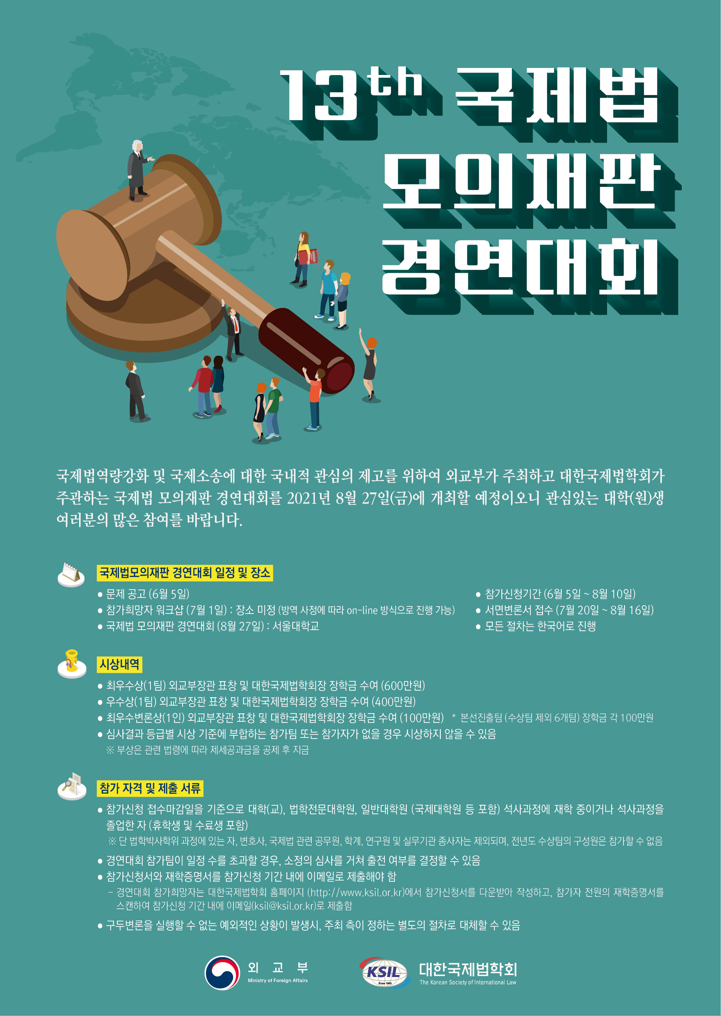 국제법역량강화 및 국제소송에 대한 국내적 관심의 제고를 위하여 외교부가 주최하고 대한국제법학회가 주관하는 국제법 모의재판 경연대회를 2021년 8월 27일(금)에 개최할 예정이오니 관심있는 대학(원)생 여러분의 많은 참여를 바랍니다.