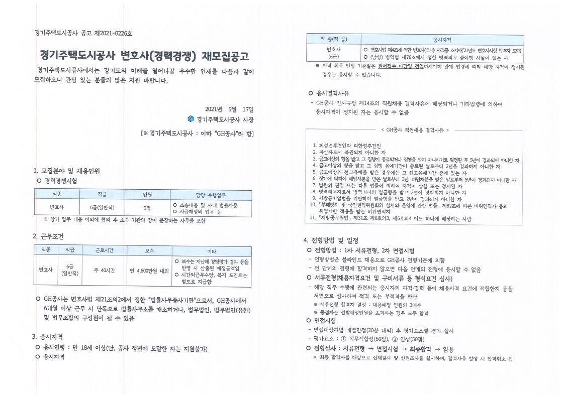 외부기관공고 홈알림마당외부기관공고 경기주택도시공사 변호사(경력경쟁) 재모집공고 경기주택도시공사 변호사(경력경쟁) 재모집공고 법학전문대학원2021-05-27 페이스북 트위터 구글플러스 이메일 프린트 이전외부기관공고다음