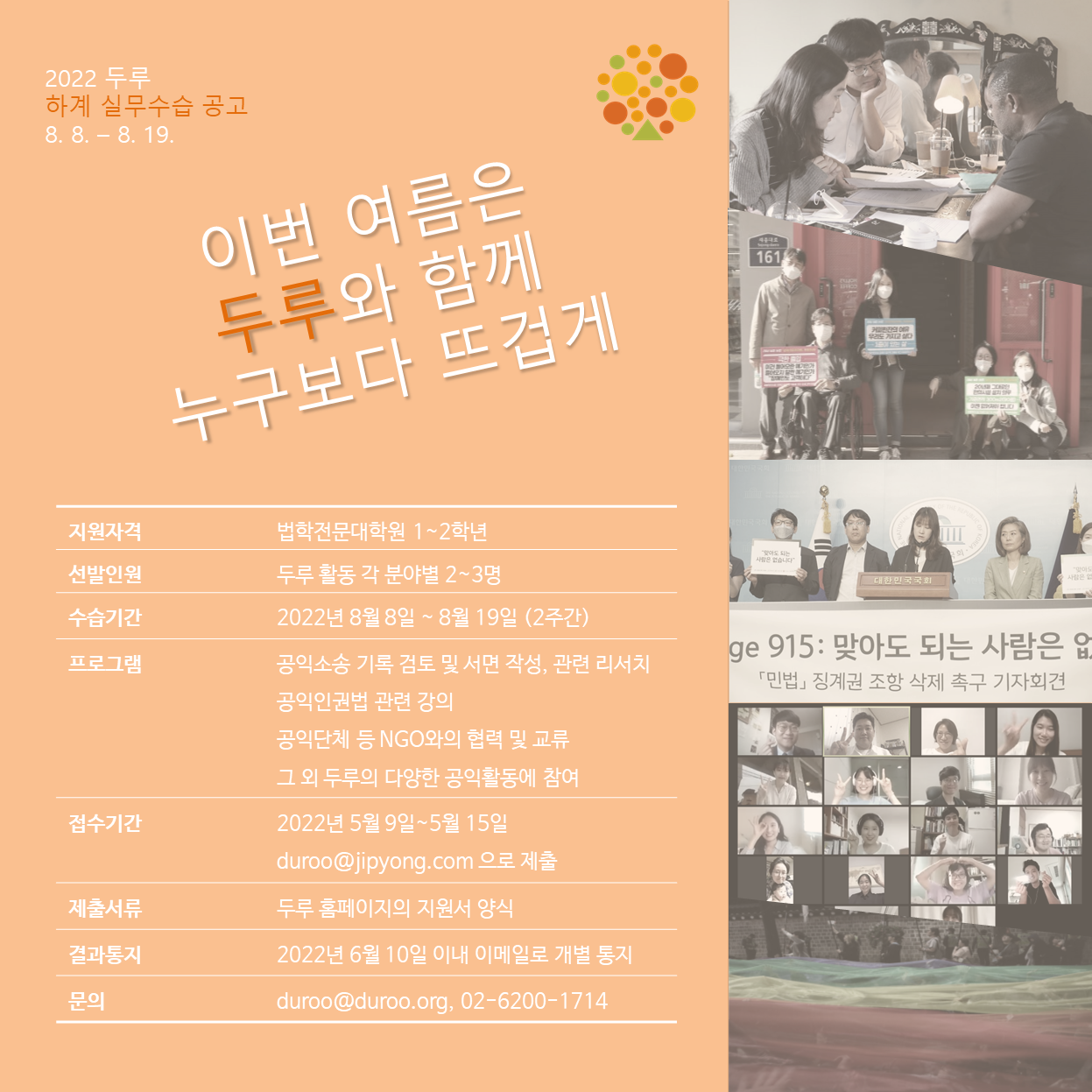 | [사단법인 두루] 2022년 하계 실무수습 안내 | |