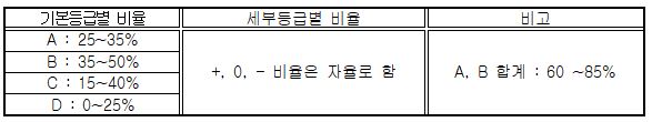 가. 전공필수와 전공선택의 구분 없이 등급별 비율만 적용되는 것으로 변경나. 각 등급영역 내의 +, 0, – 의 경우 교수 재량에 따라 부여 가능다. 10명 이하의 경우 A등급 40프로만 적용하며 하위 등급 비율 적용라. 소숫점이 발생하는 경우 비율을 초과하더라도 올림하여 정수 처리 가능