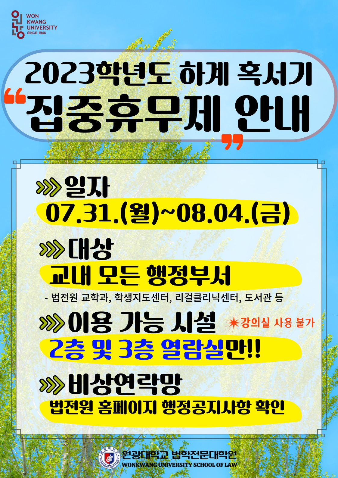 행정공지사항 홈알림마당행정공지사항 2023학년도 하계 집중휴무제 공지 2023학년도 하계 집중휴무제 공지 법학전문대학원2023-07-24 페이스북 트위터 구글플러스 이메일 프린트 이전행정공지사항다음