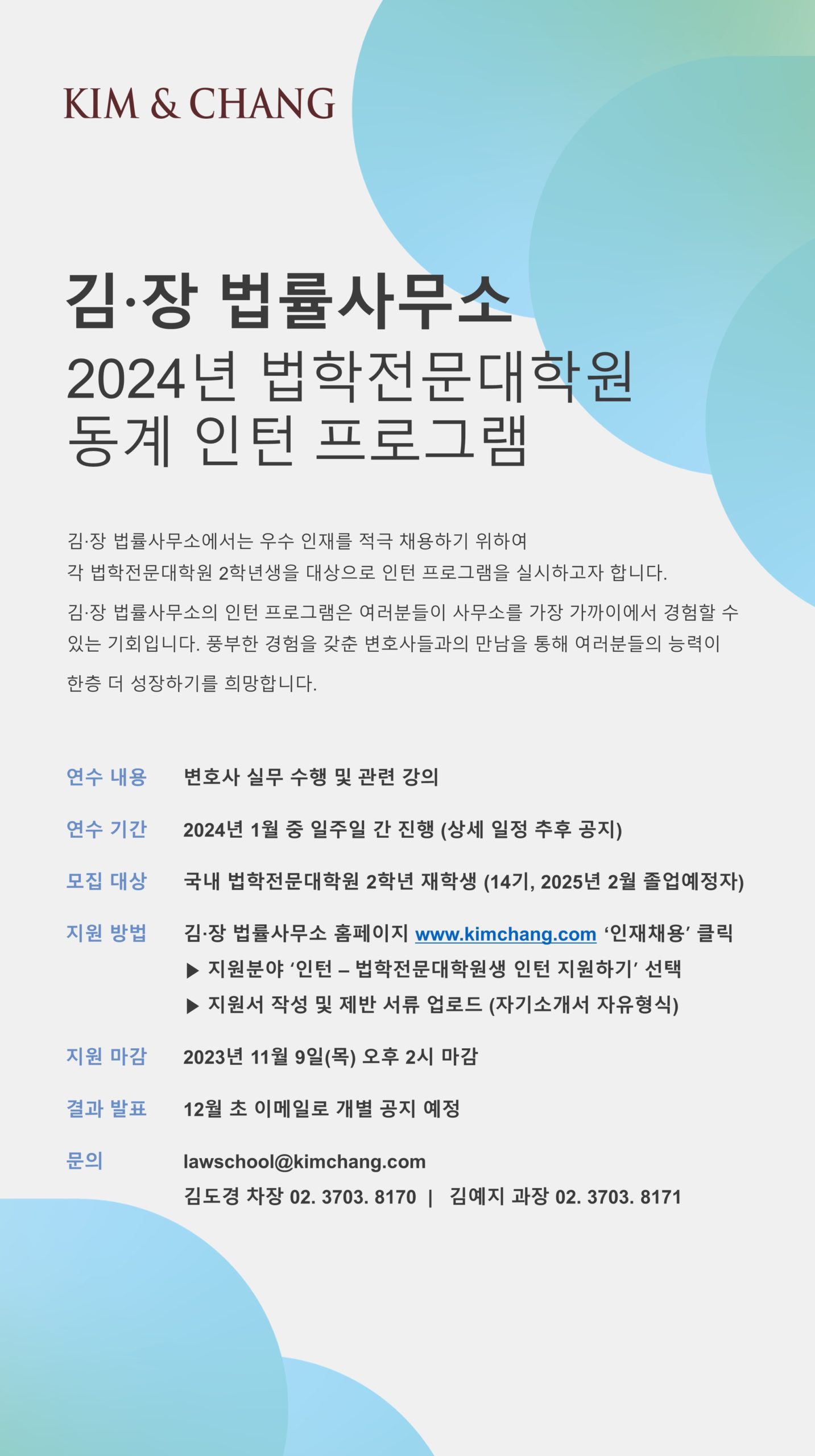 외부기관공고 홈알림마당외부기관공고 [김.장 법률사무소] 동계 인턴 지원 안내 [김.장 법률사무소] 동계 인턴 지원 안내 법학전문대학원2023-10-16 페이스북 트위터 구글플러스 이메일 프린트 이전외부기관공고다음