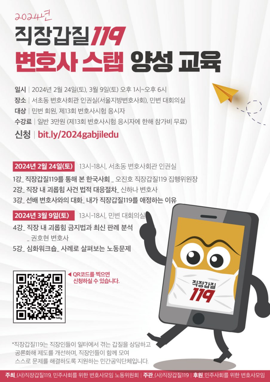 2024년 사단법인 직장갑질119 ‘변호사 스탭’ 양성 교육교유참가 신청하기 클릭 직장갑질119가 궁금하다면 클릭 *대상 – 민주사회를 위한 변호사모임 회원, 제13회 변호사시험 응시자 *일시 및 장소 – 2월 24일(토) 오후 1시~오후 6시, 서초동 변호사회관 인권실(서울지방변호사회) – 3월 9일(토) 오후 1시~오후 6시, 민변 대회의실 *주최 – 직장갑질119, 민주사회를 위한 변호사모임 노동위원회 *주관 – 직장갑질119 *후원 – 민주사회를 위한 변호사모임 *참가비 – 3만원(제13회 변호사시험 응시자는 무료) *문의 – 직장갑질119 정현철 사무국장 010-9273-1948, 신하나 변호사 010-7744-2116 *참가비 납부계좌 – 농협 119-119-9118 사단법인 직장갑질119 *전체 프로그램 참여시 수료증 지급 **직장갑질119는 일하는 사람들이 일터에서 겪는 갑질을 상담하고 공론화해 제도를 개선하며, 직장인들이 함께 모여 스스로 문제를 해결하도록 지원하는 민간공익단체입니다.