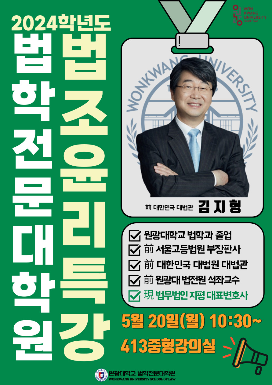 학사공지사항 홈알림마당학사공지사항 2024학년도 법조윤리특강 안내 2024학년도 법조윤리특강 안내 법학전문대학원2024-05-07 페이스북 트위터 구글플러스 이메일 프린트 [2024학년도 법조윤리특강 안내] 일시 : 2024.05.20.(월) 10:30~ 장소 : 413중형상의실 2024-1학기 법조윤리 수강생 필참(출석 확인) 이전학사공지사항다음