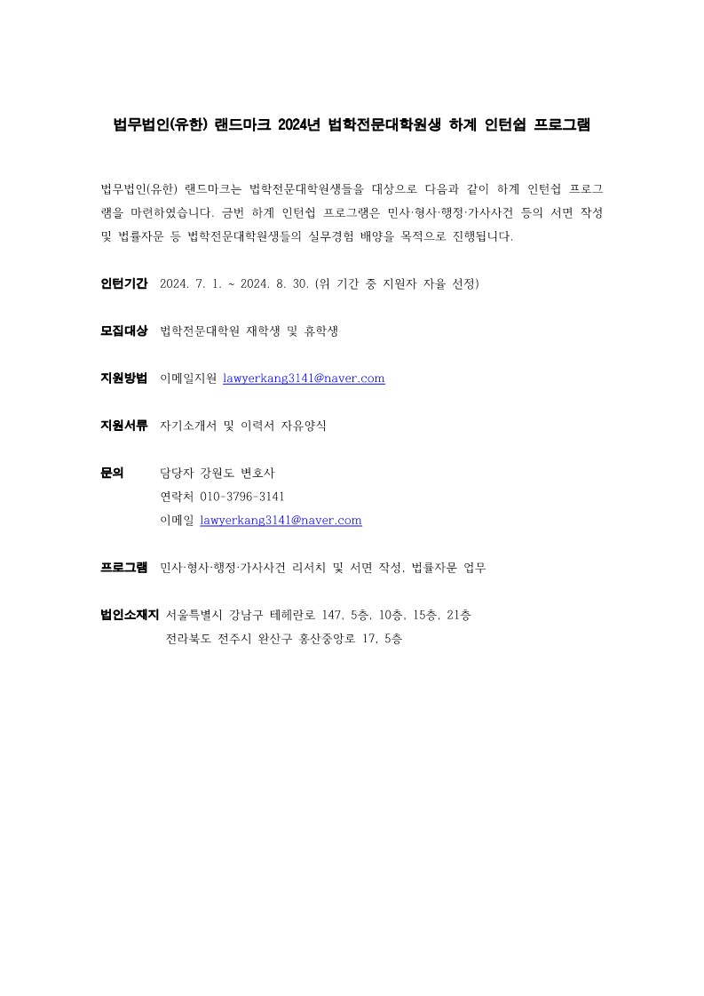 외부기관공고 홈알림마당외부기관공고 법무법인 (유한) 랜드마크 2024년 하계 인턴쉽 안내문[마감] 법무법인 (유한) 랜드마크 2024년 하계 인턴쉽 안내문[마감] 법학전문대학원2024-05-20 페이스북 트위터 구글플러스 이메일 프린트 이전외부기관공고다음
