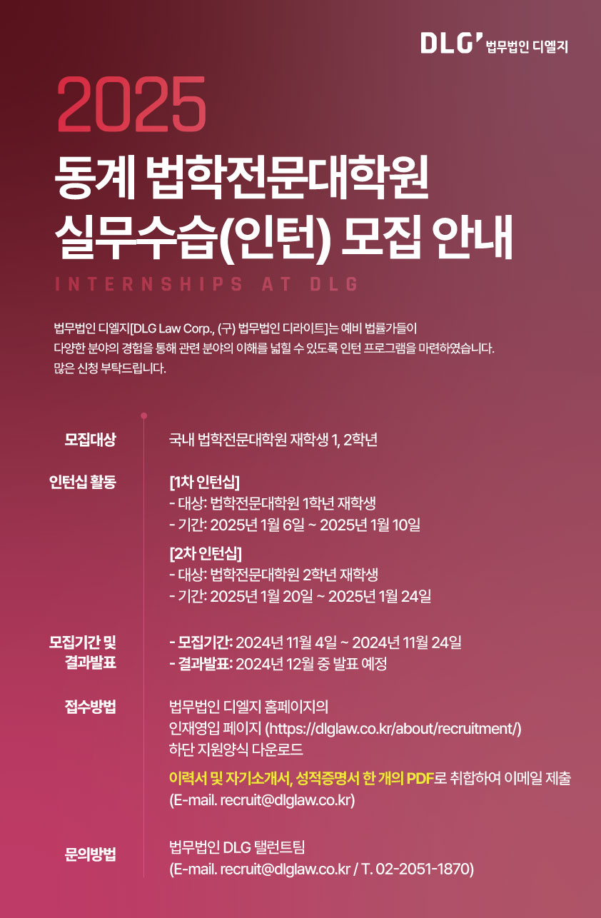 실무수습안내 홈알림마당실무수습안내 [DLG] 2025년 법무법인 디엘지 동계 법학전문대학원 실무수습 모집 안내 [DLG] 2025년 법무법인 디엘지 동계 법학전문대학원 실무수습 모집 안내 법학전문대학원2024-10-29 페이스북 트위터 구글플러스 이메일 프린트 홈페이지 링크: https://dlglaw.co.kr/ Download (PDF, 196KB) 이전실무수습안내다음