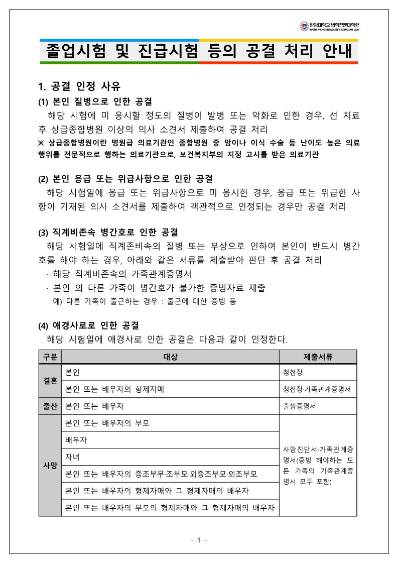 학사공지사항 홈알림마당학사공지사항 졸업시험 및 진급시험 등의 공결 처리 세부 안내 졸업시험 및 진급시험 등의 공결 처리 세부 안내 법학전문대학원2024-11-14 페이스북 트위터 구글플러스 이메일 프린트 졸업시험 및 진급시험 등의 공결 처리 세부 안내 사항입니다. 이전학사공지사항다음