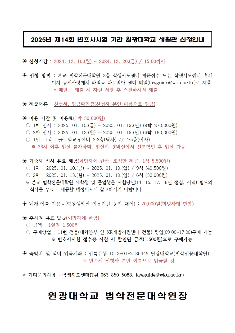 행정공지사항 홈알림마당행정공지사항 2025년 14회 변호사시험 학생생활관 이용 신청안내 2025년 14회 변호사시험 학생생활관 이용 신청안내 법학전문대학원2024-12-02 페이스북 트위터 구글플러스 이메일 프린트 신청서 다운로드: 2025년 제14회 변호사시험 기간 원광대 학생생활관 이용 신청서 이전행정공지사항다음