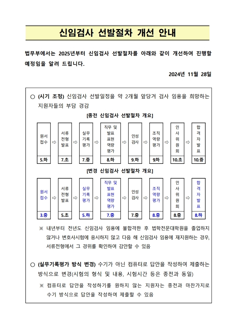 학사공지사항 홈알림마당행정공지사항 2025년도 법무부 신임검사 선발절차 개선 안내 2025년도 법무부 신임검사 선발절차 개선 안내 법학전문대학원2024-12-09 페이스북 트위터 구글플러스 이메일 프린트 이전학사공지사항다음