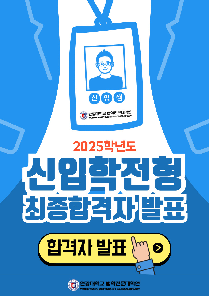 입학공지 홈입학안내입학공지 2025학년도 법학전문대학원 신입학 최종 합격자 조회 2025학년도 법학전문대학원 신입학 최종 합격자 조회 법학전문대학원2024-12-19 페이스북 트위터 구글플러스 이메일 프린트 최종합격자 발표 페이지 이전입학공지다음