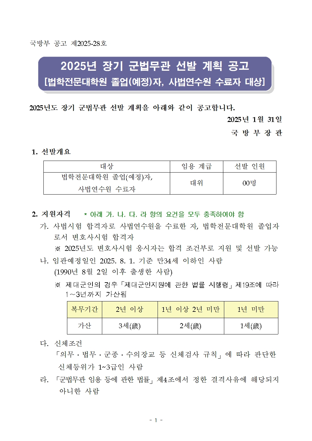 실무수습안내 홈알림마당실무수습안내 2025년 장기 군법무관 선발 계획 공고(~03.11기간 수정) 2025년 장기 군법무관 선발 계획 공고(~03.11기간 수정) 법학전문대학원2025-03-04 페이스북 트위터 구글플러스 이메일 프린트 서식 다운로드 페이지 링크: 국방부 이전실무수습안내다음