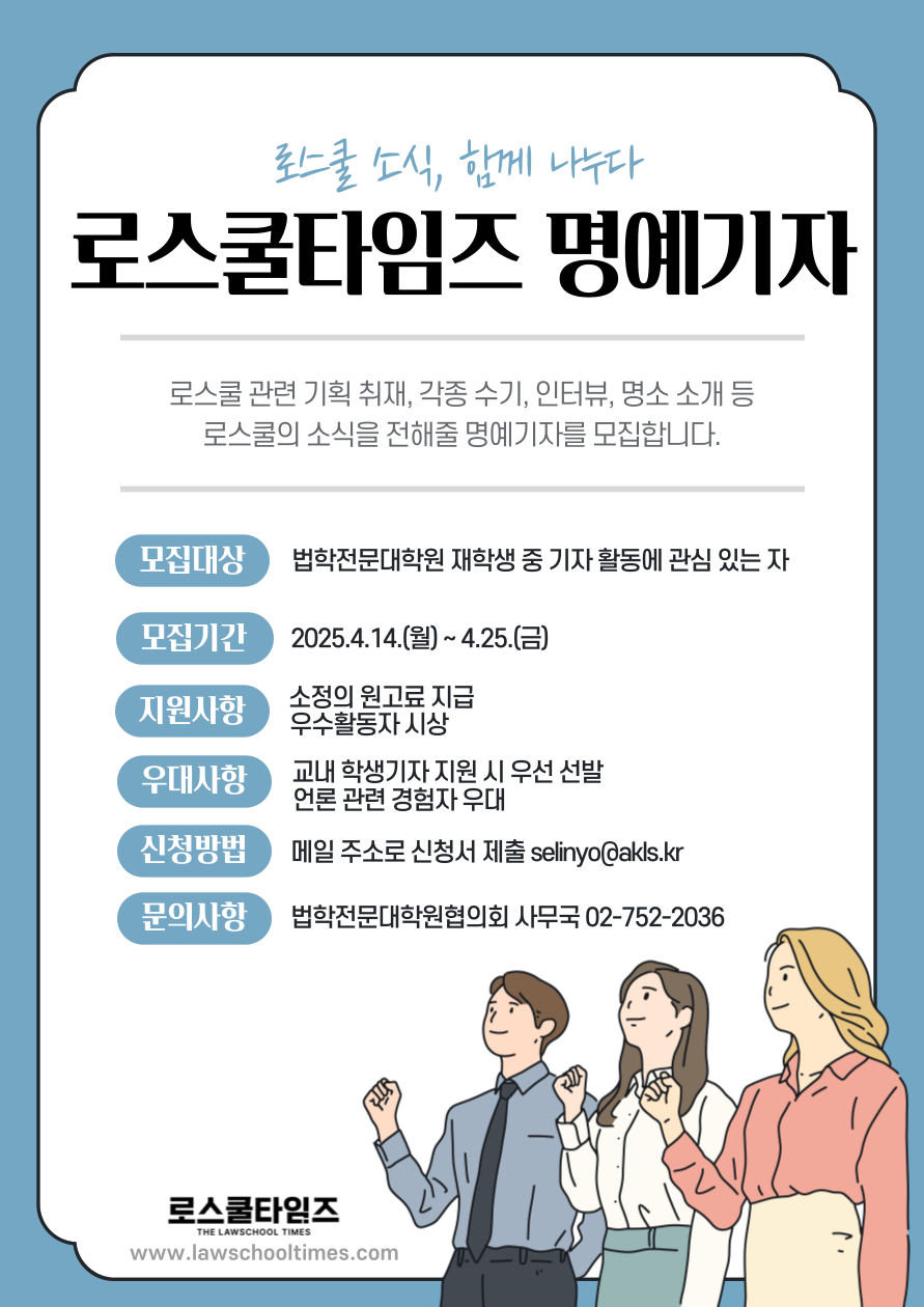 외부기관공고 홈알림마당외부기관공고 [법학전문대학원협의회] 로스쿨타임즈 명예기자 모집 [법학전문대학원협의회] 로스쿨타임즈 명예기자 모집 법학전문대학원2025-04-14 페이스북 트위터 구글플러스 이메일 프린트 Download (PDF, 54KB) 다운로드 파일: [양식] 로스쿨타임즈 제3기 명예기자 지원서 이전외부기관공고다음