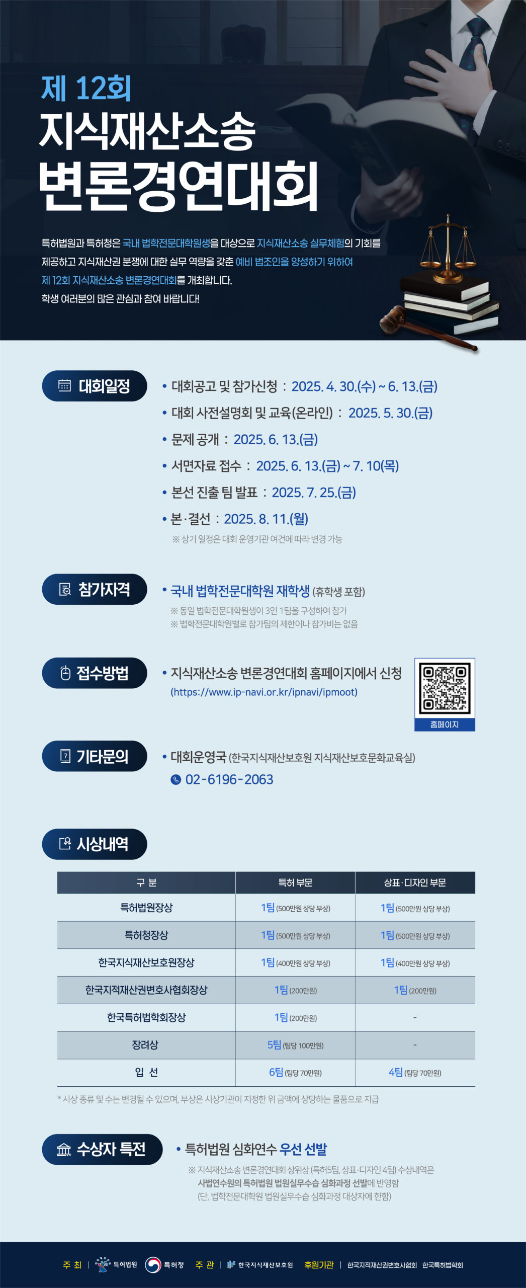 외부기관공고 홈알림마당외부기관공고 [한국지식재산보호원] 제12회 지식재산소송변론경연대회 개최 안내 [한국지식재산보호원] 제12회 지식재산소송변론경연대회 개최 안내 법학전문대학원2025-04-23 페이스북 트위터 구글플러스 이메일 프린트 Download (PDF, 98KB) 이전외부기관공고다음
