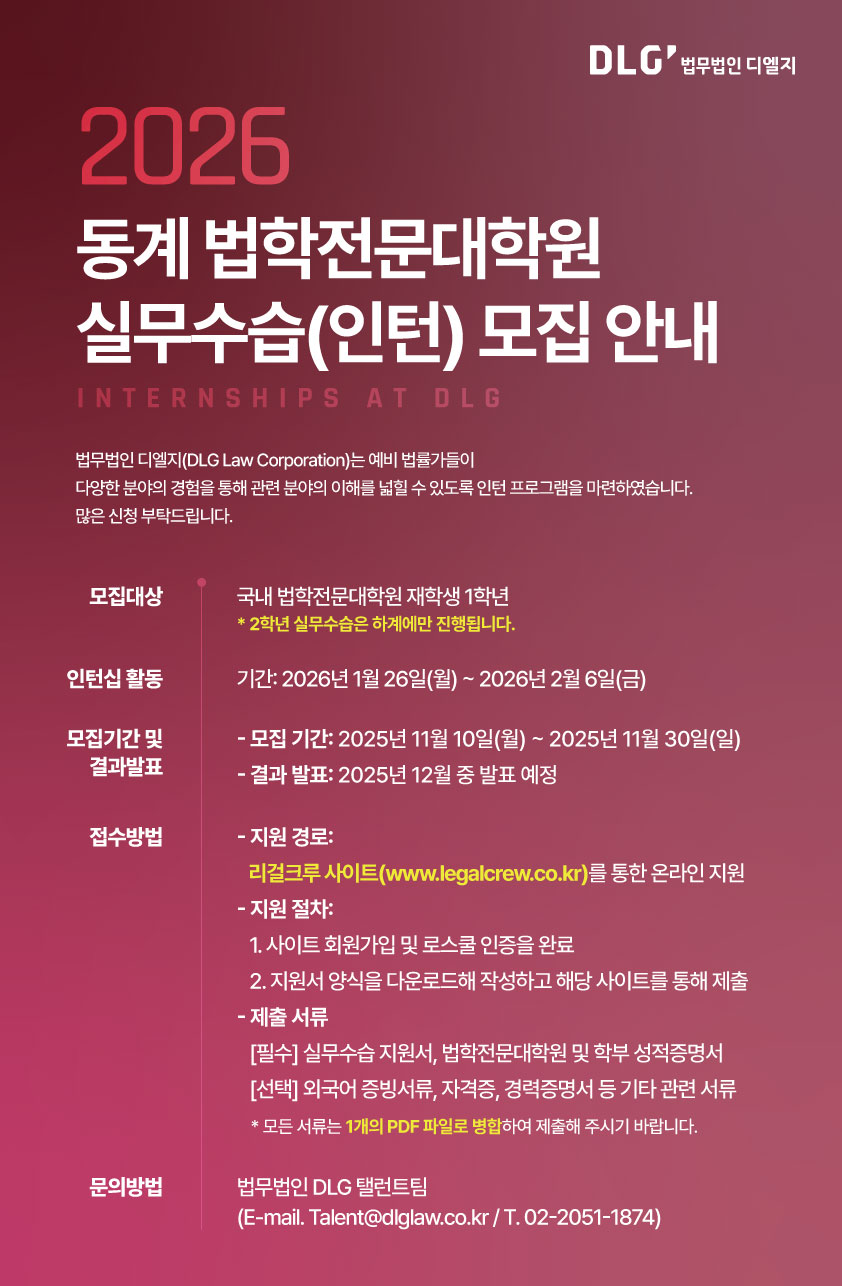 외부기관공고 홈알림마당외부기관공고 [DLG] 2026 동계 법학전문대학원 실무수습 모집 [DLG] 2026 동계 법학전문대학원 실무수습 모집 법학전문대학원2025-10-31 페이스북 트위터 구글플러스 이메일 프린트 홈페이지 링크: https://www.legalcrew.co.kr/ko/signin Download (PDF, 259KB) 이전외부기관공고다음