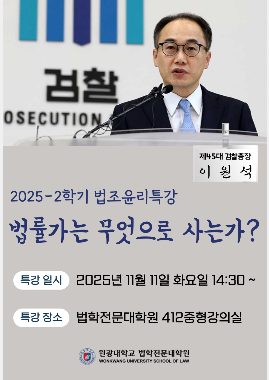 학사공지사항 홈알림마당행정공지사항 2025학년도 법조윤리특강 안내 2025학년도 법조윤리특강 안내 법학전문대학원2025-11-04 페이스북 트위터 구글플러스 이메일 프린트 이전학사공지사항다음
