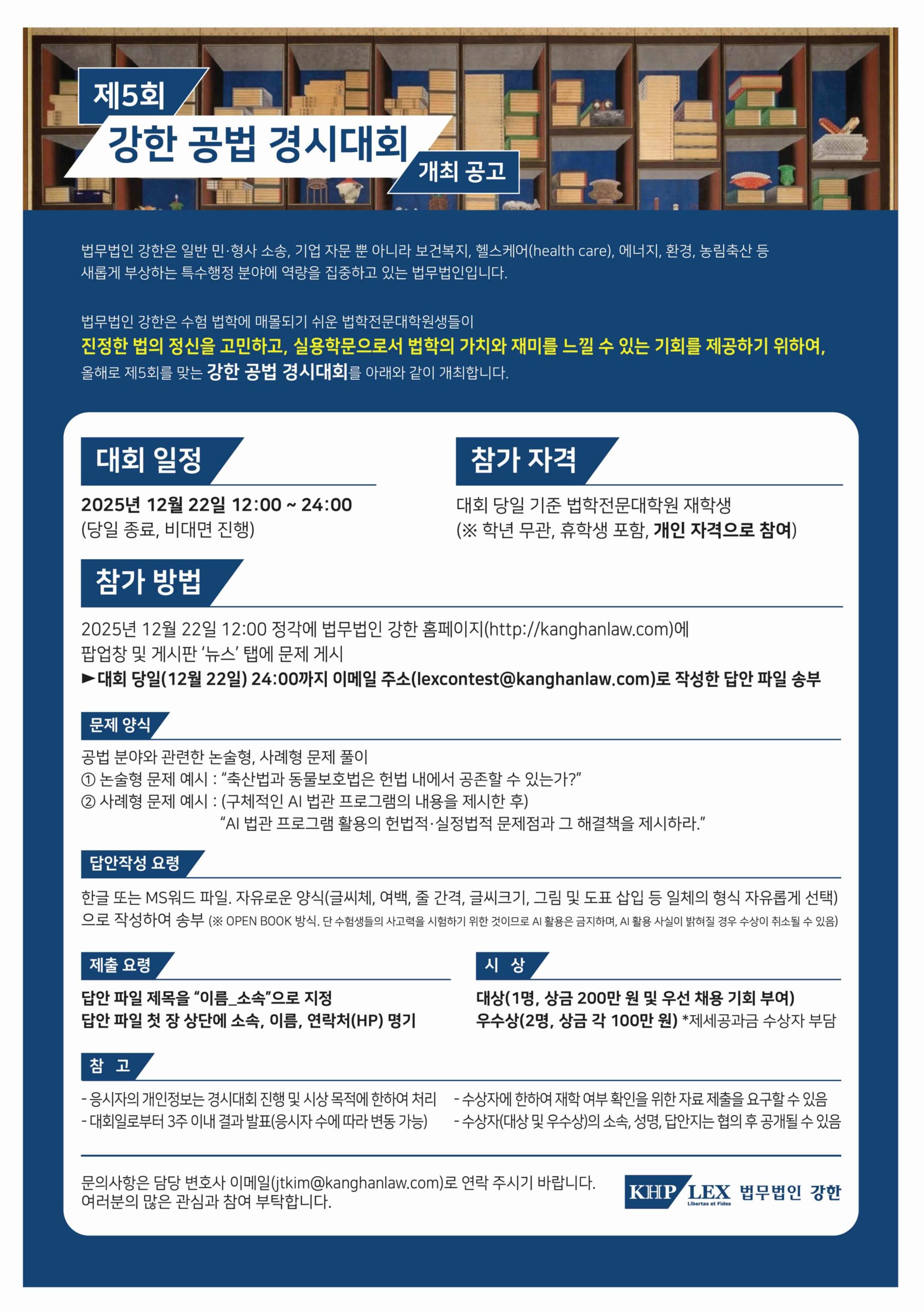 외부기관공고 홈알림마당외부기관공고 [법무법인 강한] 제5회 강한 공법 경시대회 개최 공고 [법무법인 강한] 제5회 강한 공법 경시대회 개최 공고 법학전문대학원2025-11-24 페이스북 트위터 구글플러스 이메일 프린트 Download (PDF, 123KB) 이전외부기관공고다음