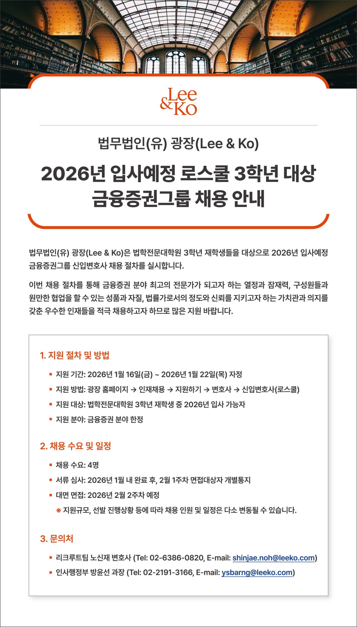 외부기관공고 홈알림마당외부기관공고 [법무법인(유) 광장] 금융증권그룹 채용 공고 [법무법인(유) 광장] 금융증권그룹 채용 공고 법학전문대학원2026-01-12 페이스북 트위터 구글플러스 이메일 프린트 이전외부기관공고다음