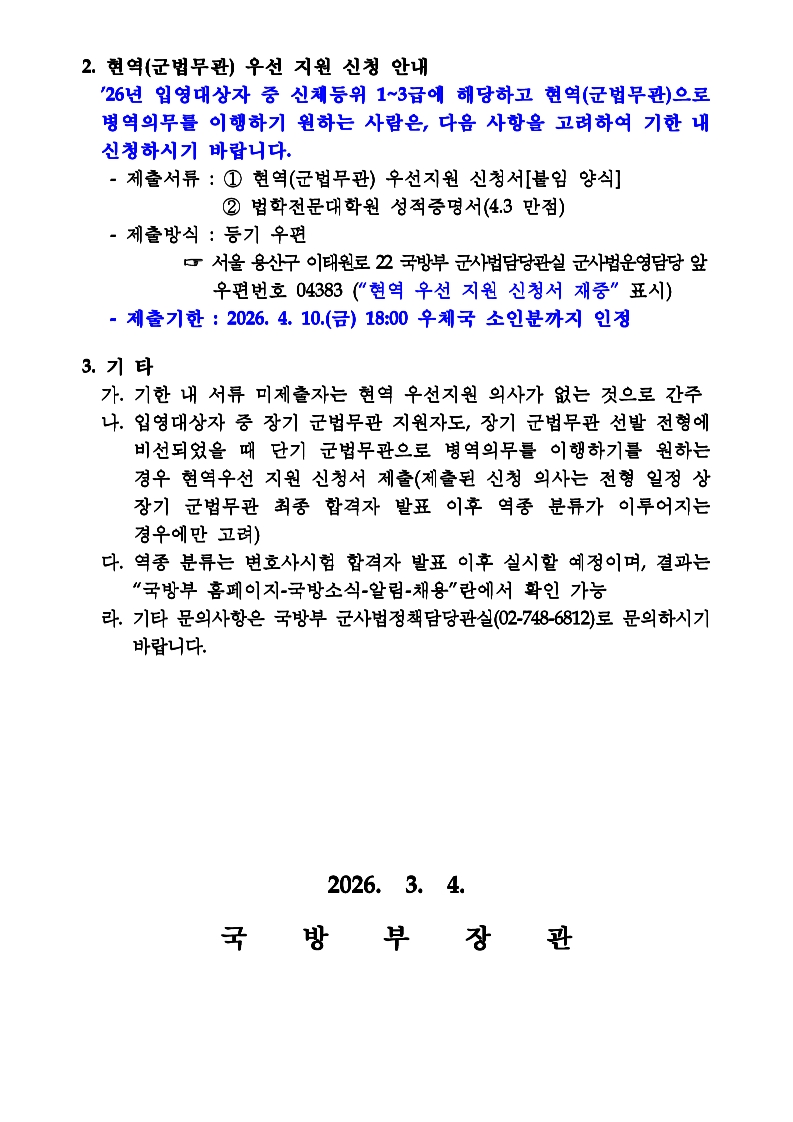 외부기관공고 홈알림마당외부기관공고 2026년 현역(군법무관) 우선 지원 신청 안내 2026년 현역(군법무관) 우선 지원 신청 안내 법학전문대학원2026-03-09 페이스북 트위터 구글플러스 이메일 프린트 첨부파일 : 공고문 및 신청서(단기 군법무관) 이전외부기관공고