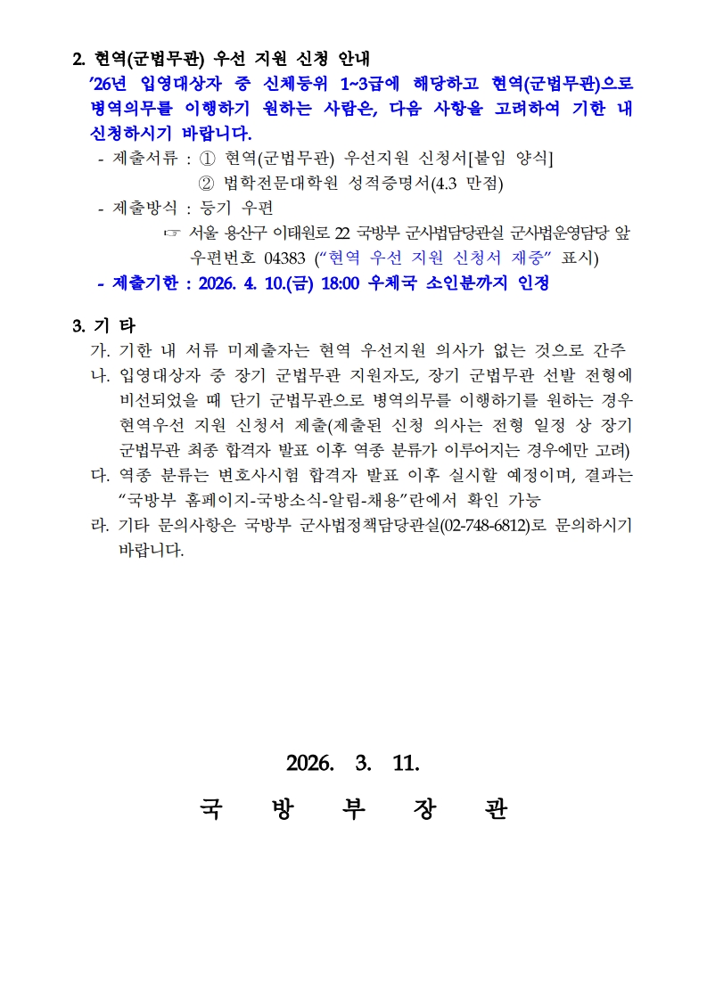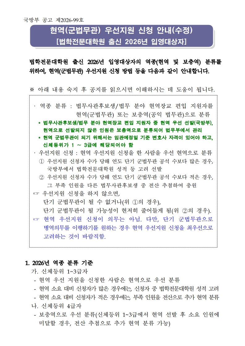 외부기관공고 홈알림마당외부기관공고 2026년 현역(군법무관) 우선 지원 신청 안내(수정) 2026년 현역(군법무관) 우선 지원 신청 안내(수정) 법학전문대학원2026-03-13 페이스북 트위터 구글플러스 이메일 프린트 첨부파일 : 현역 우선지원 신청서(양식) 이전외부기관공고