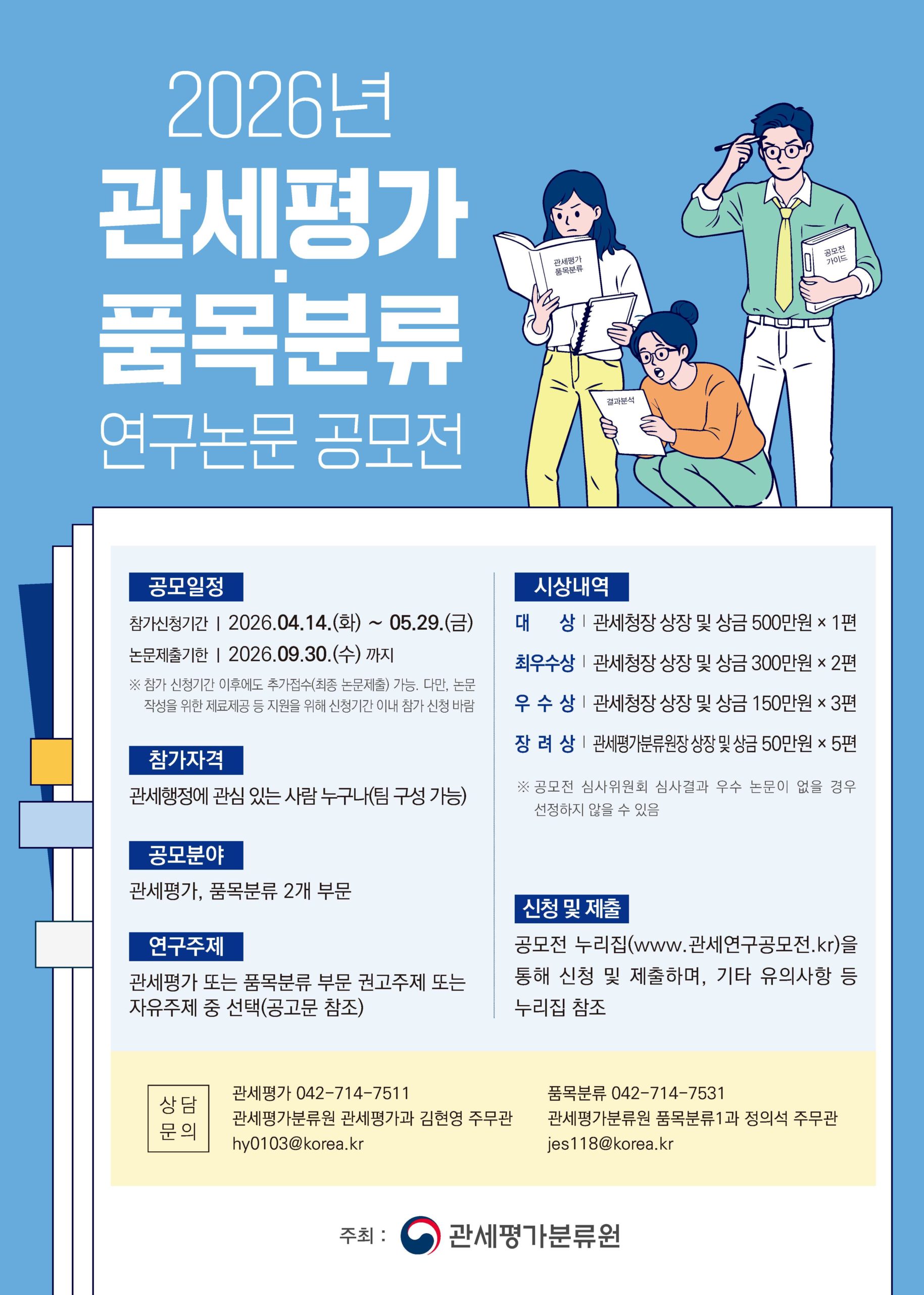 □ 2026년도 관세평가 및 품목분류 연구논문 공모전 ㅇ 참가자격 : 관세행정에 관심 있는 사람 누구나(3인이내 팀 구성 가능) ㅇ 부문 : 관세평가, 품목분류 2개 부문 ㅇ 참가신청 : 2026. 4. 14.(화) ∼ 5. 29.(금) – 참가 신청 기간 이후에도 추가접수 가능 ㅇ 논문제출 : 공고일로부터 2026. 9. 30.(수)까지 ㅇ 시상 : 관세청장 상장 및 상금(대상 500만원 등, 부문별 별도) ㅇ 문의 : 관세평가분류원 관세평가과(042-714-7511), 품목분류1과(042-714-7531)