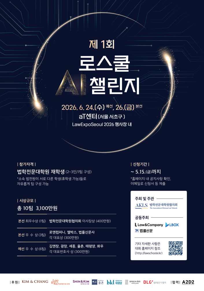 외부기관공고 홈알림마당외부기관공고 [법학전문대학원협의회] 제1회 로스쿨 AI 챌린지 공고 [법학전문대학원협의회] 제1회 로스쿨 AI 챌린지 공고 법학전문대학원2026-04-27 페이스북 트위터 구글플러스 이메일 프린트 Download (PDF, 303KB) 이전외부기관공고다음