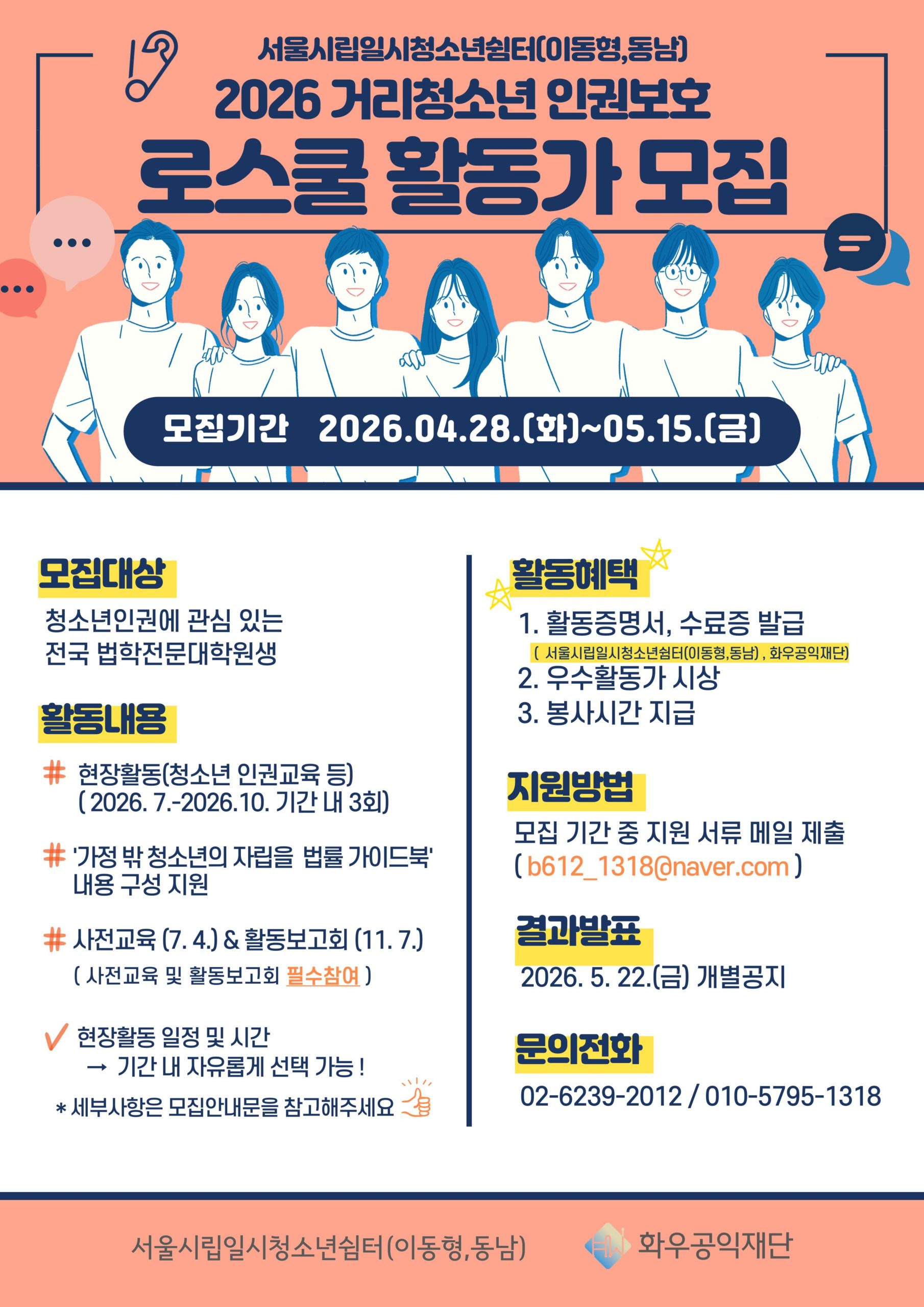 외부기관공고 홈알림마당외부기관공고 2026 거리청소년인권보호 활동가 모집 안내 2026 거리청소년인권보호 활동가 모집 안내 법학전문대학원2026-04-30 페이스북 트위터 구글플러스 이메일 프린트 첨부파일 : 2026 거리청소년인권보호 활동가 신청서 및 개인정보수집이용동의서 Download (PDF, 620KB) 이전외부기관공고