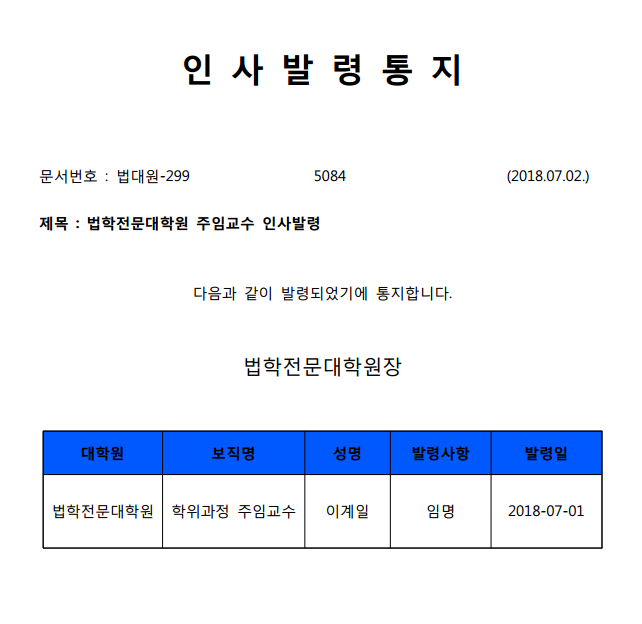 행정공지사항 홈알림마당행정공지사항 주임교수 인사발령통지 주임교수 인사발령통지 법학전문대학원2017-03-21 페이스북 트위터 구글플러스 이메일 프린트 2018.07.02. 법학전문대학원장 이전행정공지사항다음