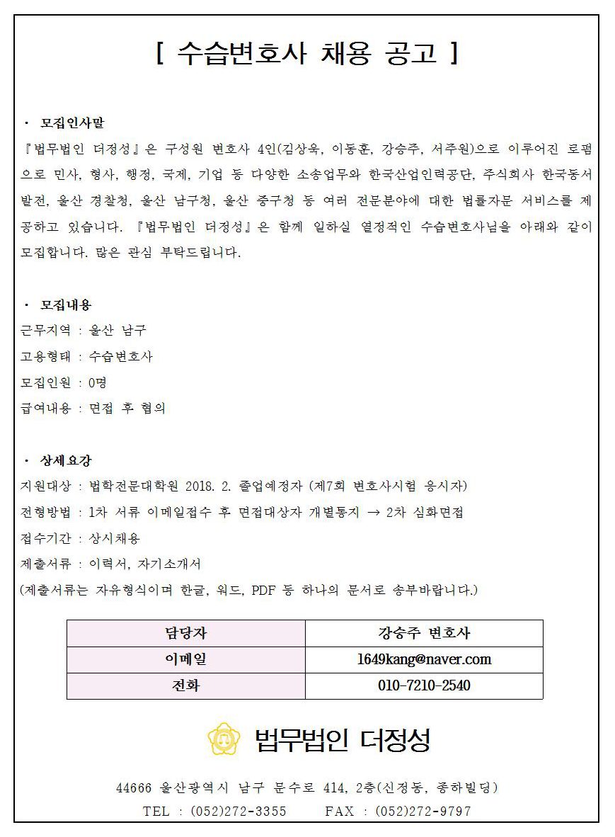 외부기관공고 홈알림마당외부기관공고 법무법인 더정성 수습변호사 채용 공고 법무법인 더정성 수습변호사 채용 공고 법학전문대학원2018-03-22 페이스북 트위터 구글플러스 이메일 프린트 이전외부기관공고다음