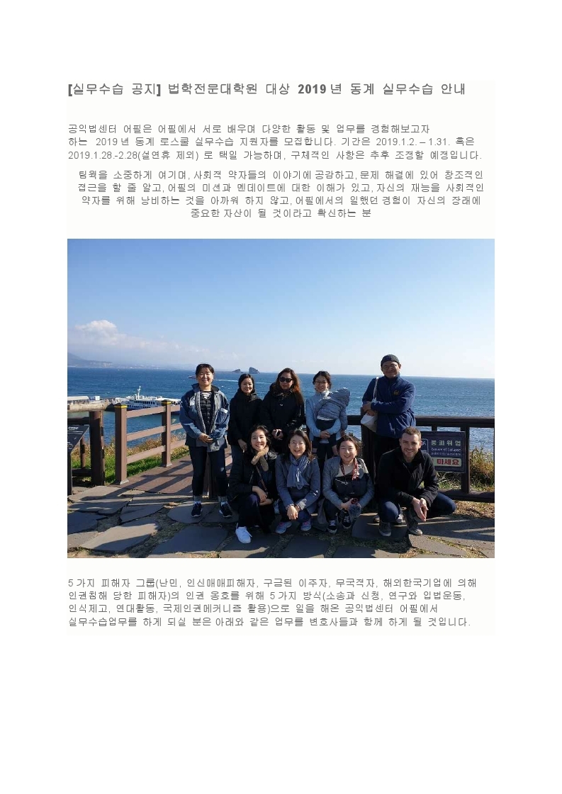 외부기관공고 홈알림마당외부기관공고 2019 동계 실무수습 공익법센터 어필 2019 동계 실무수습 공익법센터 어필 법학전문대학원2018-11-20 페이스북 트위터 구글플러스 이메일 프린트 공익법센터 어필_2019년 동계 실무수습 지원서 이전외부기관공고다음