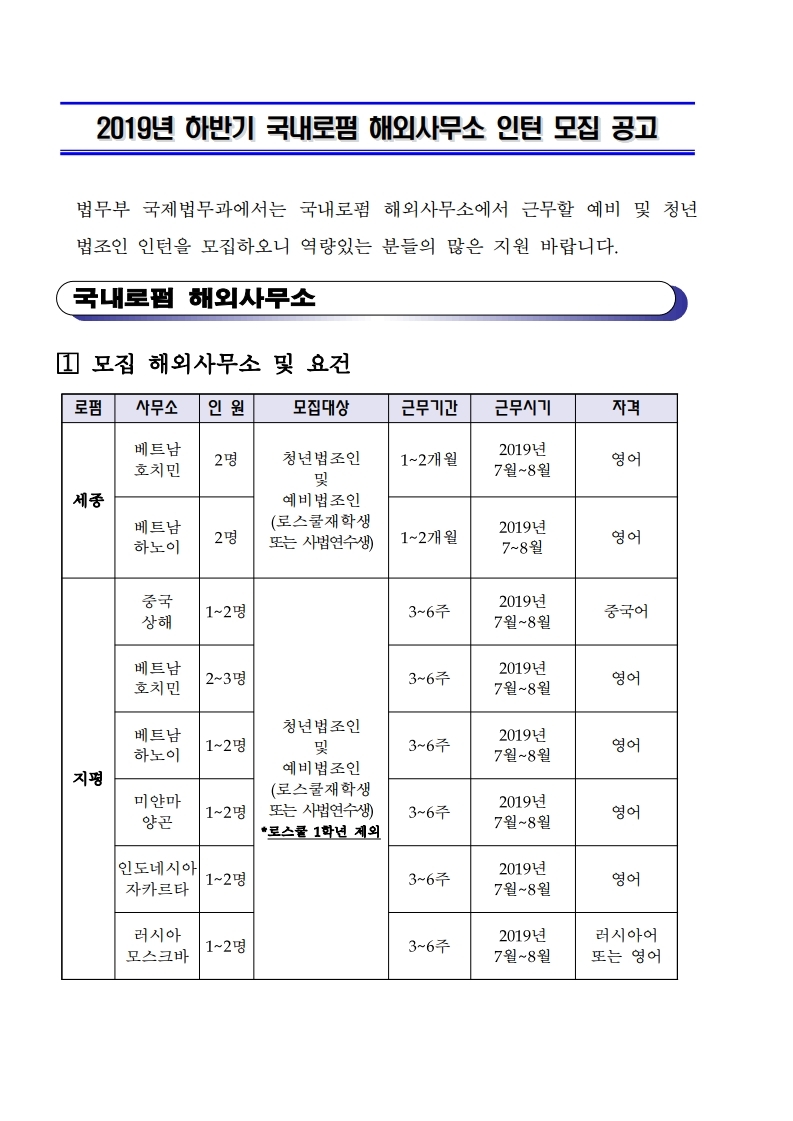 외부기관공고 홈알림마당외부기관공고 2019년 하반기 국내로펌 해외사무소 인턴 모집 공고 2019년 하반기 국내로펌 해외사무소 인턴 모집 공고 법학전문대학원2019-05-02 페이스북 트위터 구글플러스 이메일 프린트 ※ 다운로드 첨부파일 : 2019년 하반기 국내로펌 해외사무소 인턴모집공고 양식 이전외부기관공고다음