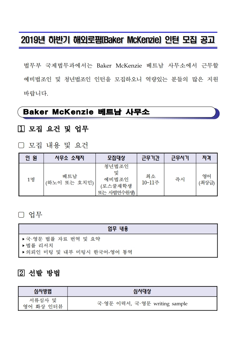 외부기관공고 홈알림마당외부기관공고 2019년 하반기 해외로펌(Baker McKenzie) 인턴 모집 공고 2019년 하반기 해외로펌(Baker McKenzie) 인턴 모집 공고 법학전문대학원2019-05-02 페이스북 트위터 구글플러스 이메일 프린트 ※ 다운로드 첨부파일 : 2019년 하반기 Baker McKenzie 인턴모집공고 양식 이전외부기관공고다음