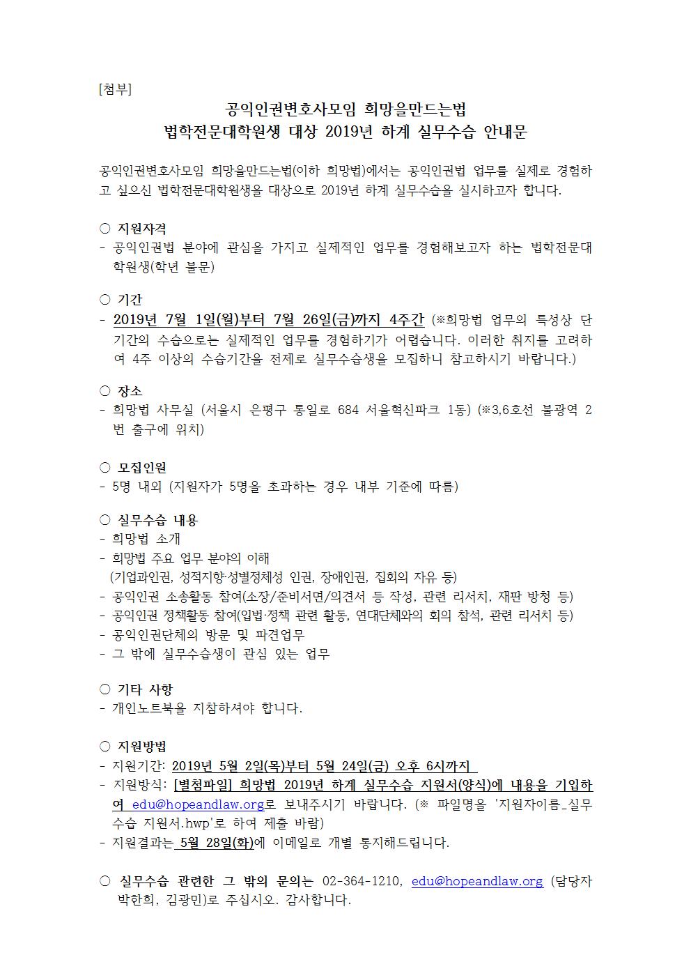 외부기관공고 홈알림마당외부기관공고 [희망을만드는법] 2019 하계 실무수습 지원 안내 [희망을만드는법] 2019 하계 실무수습 지원 안내 법학전문대학원2019-05-02 페이스북 트위터 구글플러스 이메일 프린트 ※ 다운로드 첨부파일 : 희망법 2019년 하계 실무수습 지원서(양식) 이전외부기관공고다음