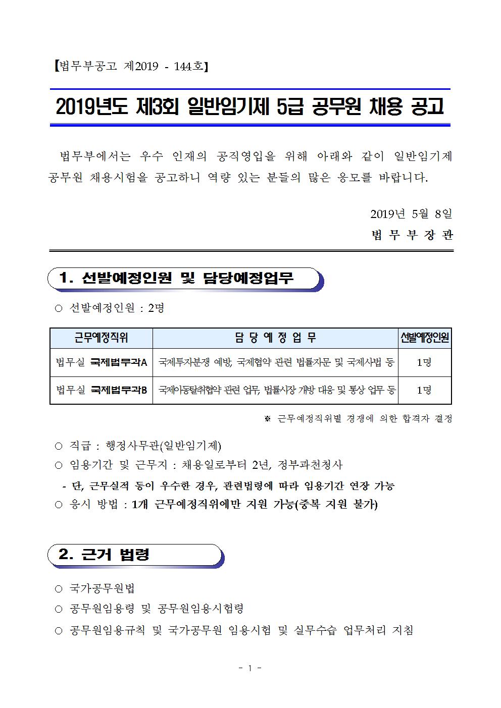 외부기관공고 홈알림마당외부기관공고 2019년도 제3회 일반임기제 5급 공무원 채용 공고 2019년도 제3회 일반임기제 5급 공무원 채용 공고 법학전문대학원2019-05-10 페이스북 트위터 구글플러스 이메일 프린트 ※ 다운로드 첨부파일 : 응시자 제출서류 이전외부기관공고다음