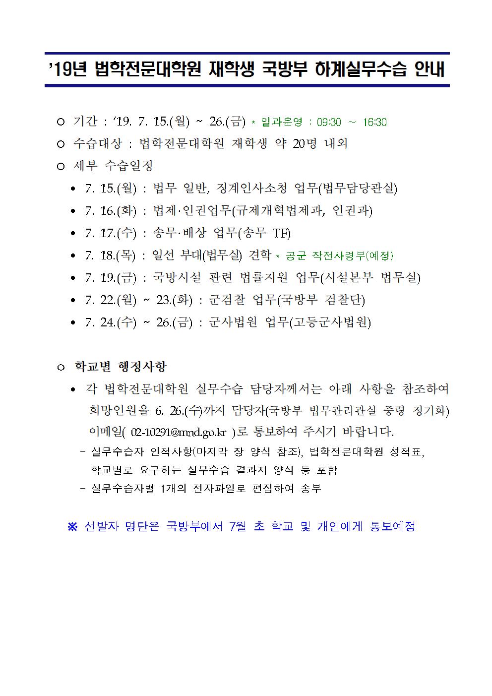 외부기관공고 홈알림마당외부기관공고 2019 하계 국방부 실무실습 2019 하계 국방부 실무실습 법학전문대학원2019-06-18 페이스북 트위터 구글플러스 이메일 프린트 제출기한 : 2019.06.25 제출서류 : 인적사항, 성적증명서 제출처 : 법학전문대학원 첨부파일 : 국방부 인적사항 이전외부기관공고다음