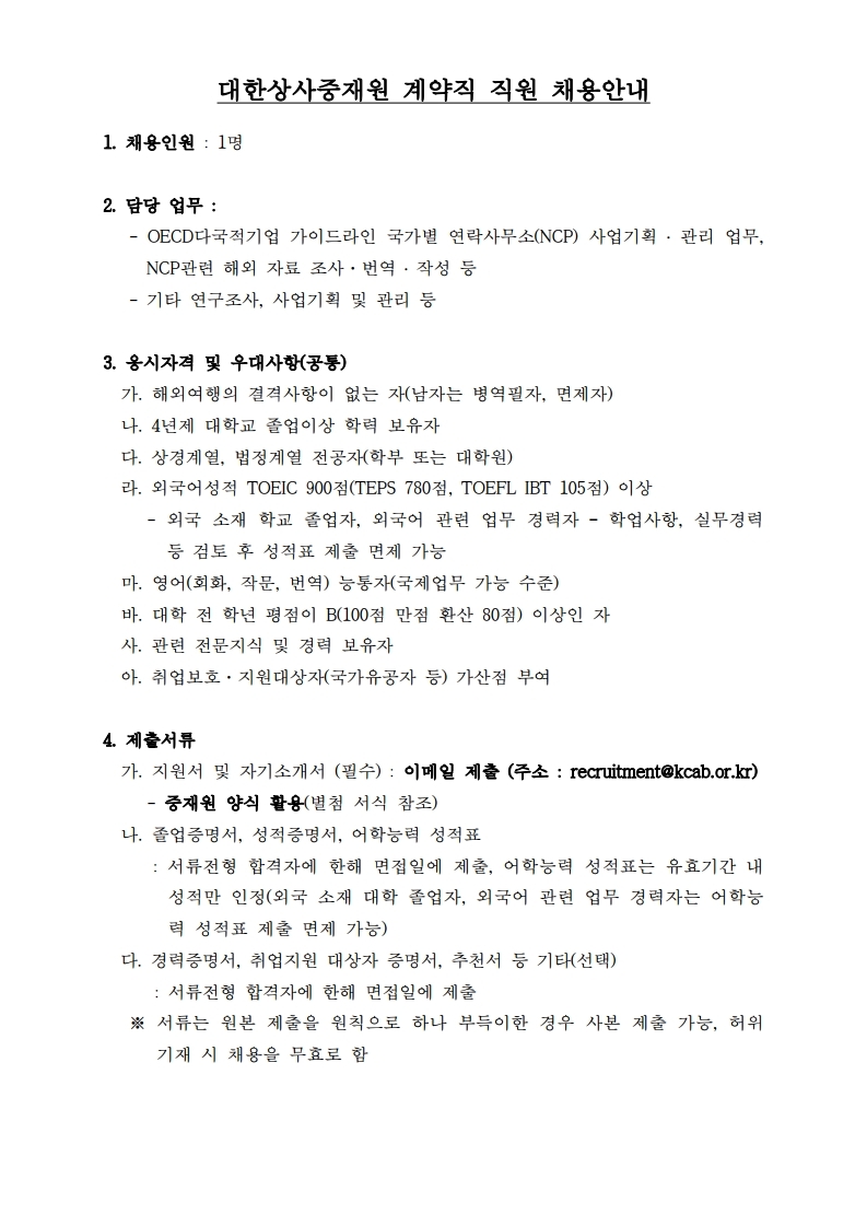 외부기관공고 홈알림마당외부기관공고 [대한상사중재원] 직원 채용 공고 관련 안내 [대한상사중재원] 직원 채용 공고 관련 안내 법학전문대학원2019-06-27 페이스북 트위터 구글플러스 이메일 프린트 ※ 다운로드 첨부파일 : 응시지원서 및 자기소개서(계약직 직원) 대한상사중재원응시지원서_국문(상해) Download (DOCX, 18KB) 대한상사중재원응시지원서_국문(LA) Download (DOCX, 18KB) 이전외부기관공고다음