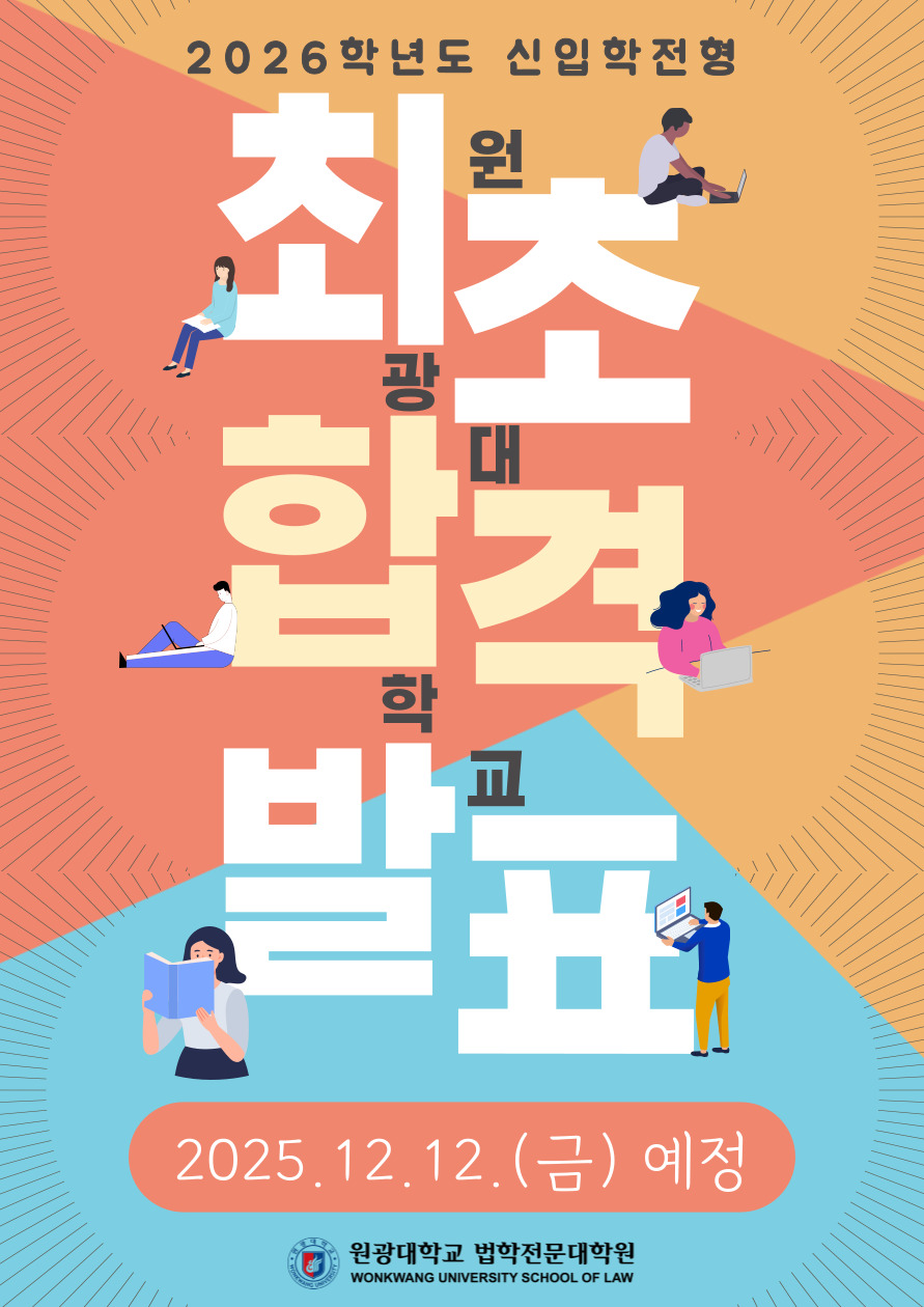 2026학년도 신입학전형 원서접수 : 2025.09.22.(월) 09:00 ~ 09.26.(금) 18:00 자세히보기 교육시설 원광대학교 법학전문대학원 시설안내 자세히보기 교수진 소개 법학전문대학원 교수진을 소개합니다 자세히보기 행정공지사항 2026년 15회 변호사시험 기간 생활관 이용 안내2025-12-03 제15회 변호사시험 시험장 최종 점검 안내2025-12-02 기말고사 기간 법전 대여 안내2025-11-28 2025학년도 동계방학 학생생활관 식당 이용 안내2025-11-28 외부기관공고 [헌법재판연구원] 2026년도 상반기 법학전문대학원생 실무수습 안내2025-12-09 2025년 제2회 [대검찰청 형사법포럼] 개최 안내2025-12-03 [법무법인(유) 광장] 로스쿨 1학년 동계 채용 안내문2025-12-01 [대한법률구조공단] 2026년 동계 법학전문대학원생 실무수습 신청 안내2025-12-01 학사공지사항 2025년 2학기 검찰실무1 기말평가 재시험 유의사항 안내2025-12-09 2025-2학기 기말고사 시간표 안내(수정)2025-12-03 2025년 2학기 검찰실무1 기말평가 재시험 공지2025-12-02 2026년 제15회 변호사시험 도시락 신청 안내2025-11-26 연락처(063) 교학과 TEL 850-5084 또는 5085 교학과 FAX 850-5086 교학과 위치 법학전문대학원 1층(익산대로 460, 26번 건물) WonkwangGuide 법무부 변호사시험법학연구소리걸클리닉센터(...경력개발센터학생지도센터법학전문도서관